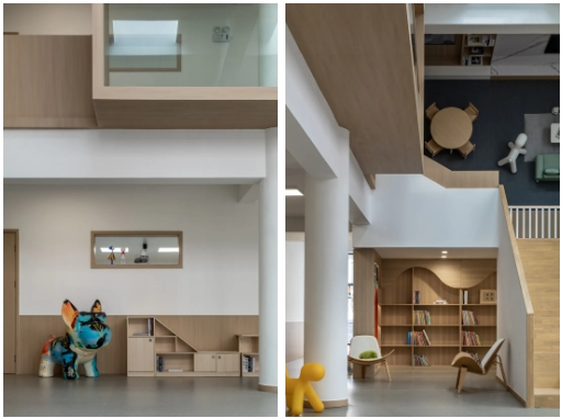 幼兒園設(shè)計裝修之墻面裝飾能起到保護(hù)墻體、延長使用壽命的作用,也能使室內(nèi)空間美觀、整潔、舒適。奧華選用灰咖楊木墻板和柜體同色進(jìn)行設(shè)計,色系風(fēng)格一致,為孩子們營造多樣性舒適空間。